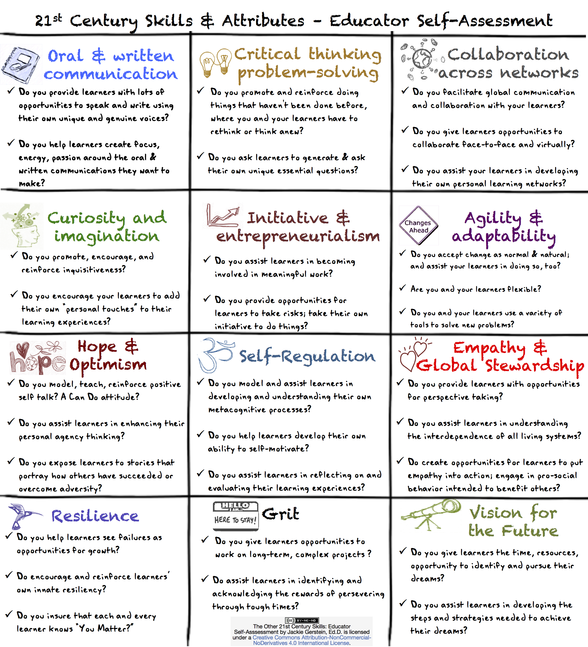 I’ve posted about The Other 21st Skills and Attributes. This post provides links and resources about these skills as well as an educator self-assessment. This assessment contains questions to assist the educator in evaluating if and how s/he is facilitating these skills and attributes in the learning environment.