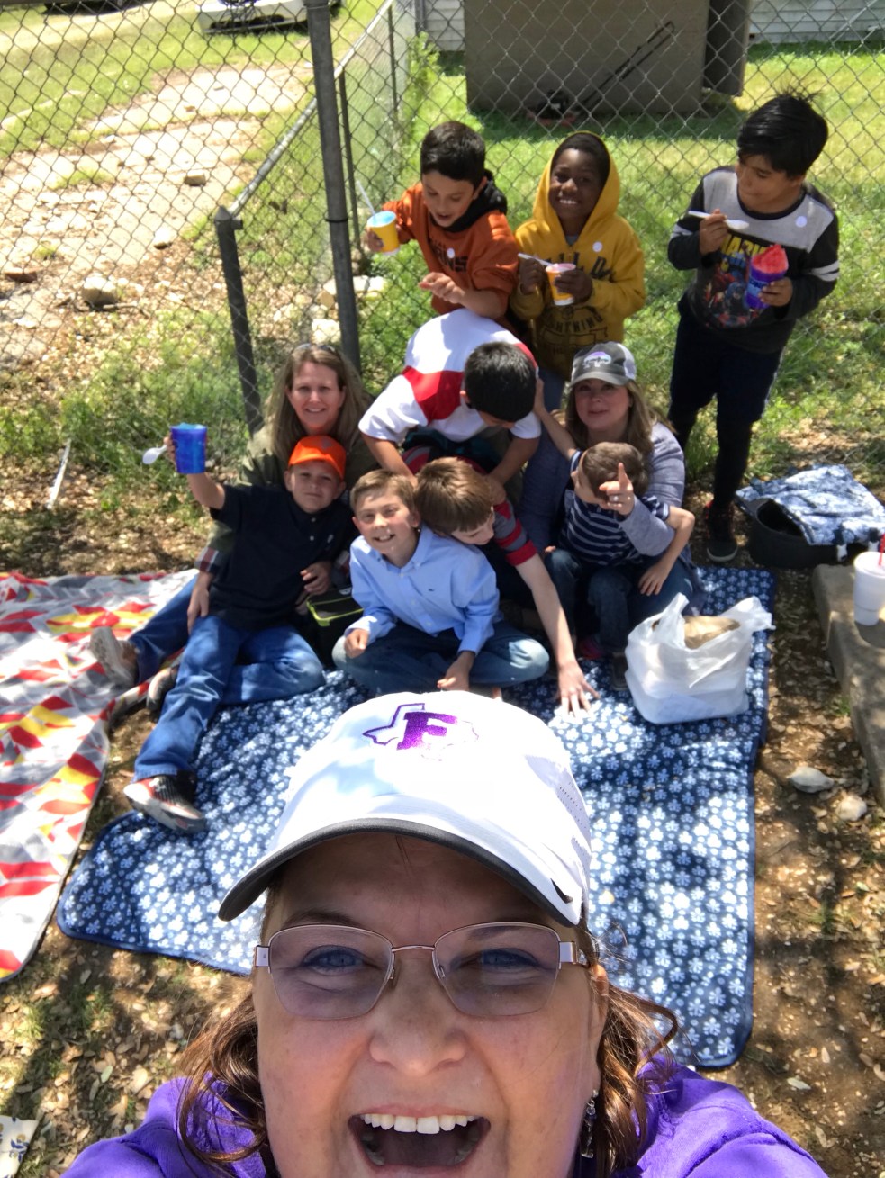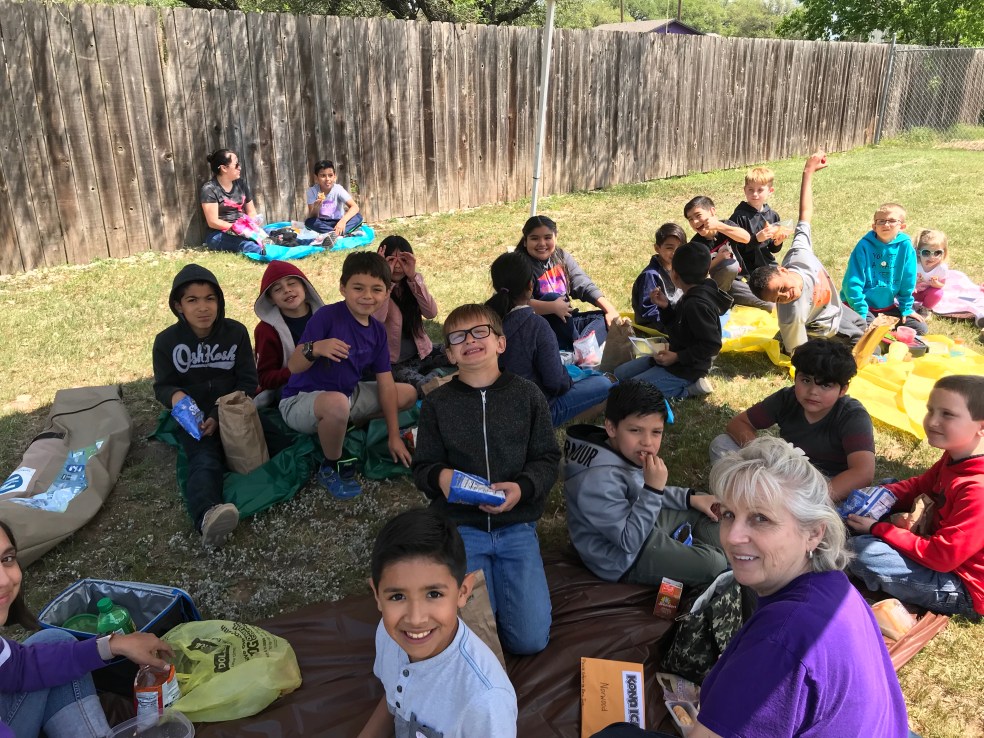 Logistically, I needed to think about where and how we would make this a great time for our kids and families. We decided to have the picnic area behind our playground area. We asked maintenance to be sure to mow and treat for ants. I rented 8 pop up canopy tents for shade purposes. I loved this part because the company set the tents up, and when we finished, they came back and picked them up. No hassel at all. I also bought a bunch of plastic tablecloths for picnic “blankets” in case families forgot to bring one of their own. Let me say that I did not have enough tents, nor did I have enough “blankets” for guests to sit on. None the less, we made due and used some of our trees for shade. Even with a headcount in the Google doc, we never anticipated that many people would attend. You see, some families actually brought true picnic baskets with their own food and goodies. It was wonderful!